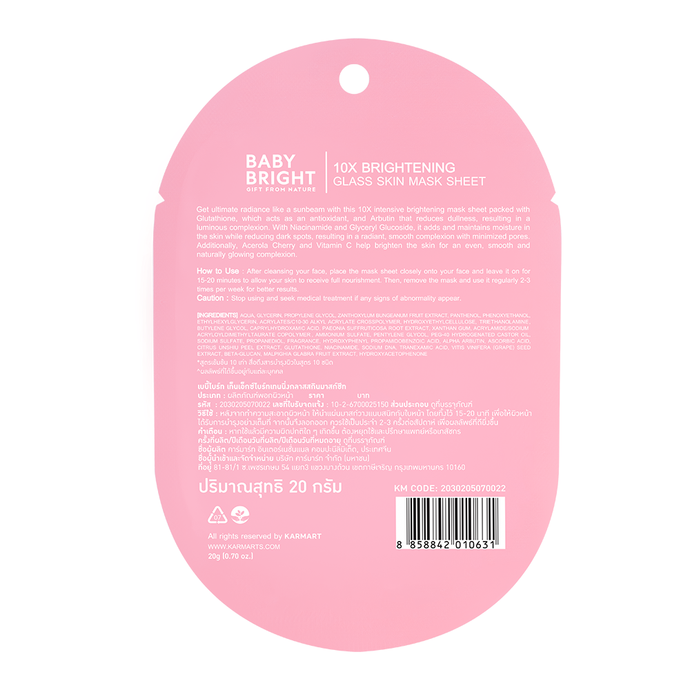 احصلي على إشراقة فائقة مثل إشراقة الشمس مع قناع 10X Glass Skin Brightening Mask من Baby Bright. تركيبة مبتكرة غنية بـ الجلوتاثيون كمضاد قوي للأكسدة، والأربوتين الذي يقلل من بهتان البشرة ويمنحك إشراقة طبيعية واضحة.